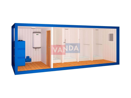 Для автономной работы душ-контейнер снабжается водонагревателем и водяным накопительным баком. Количество душевых кабинок зависит от пожеланий заказчика, но, как правило, их количество не превышает 3-5 штук.